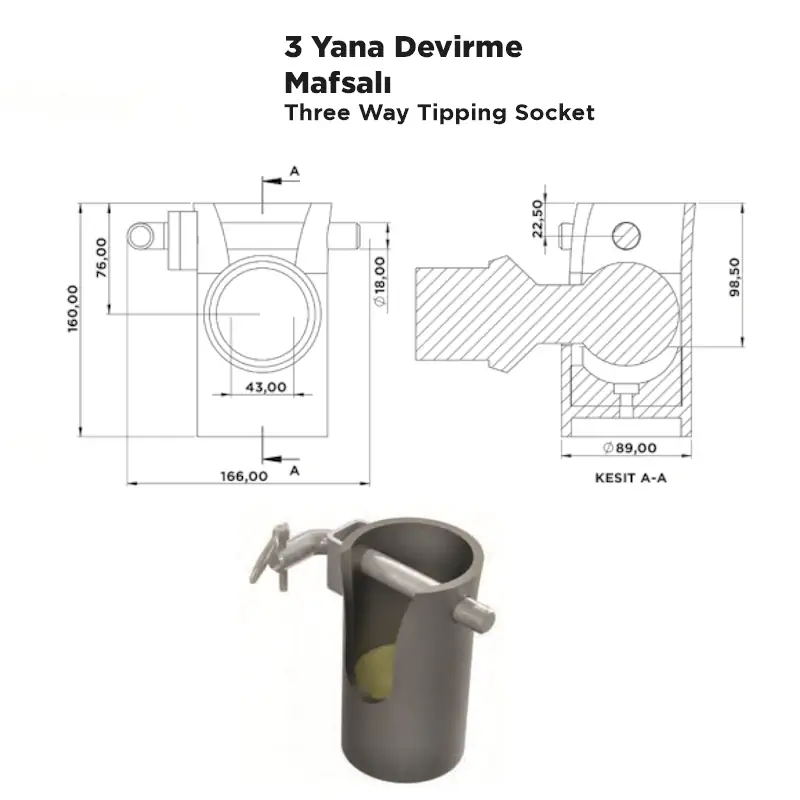 3 Yana Devirme Mafsalı, römork kasalarının üç farklı yöne (sağ, sol ve arka) devrilmesini mümkün kılan, hareketli bağlantı elemanıdır. Mafsal yapısı sayesinde kasanın yatay eksende kontrollü ve dengeli şekilde devrilmesini sağlar.