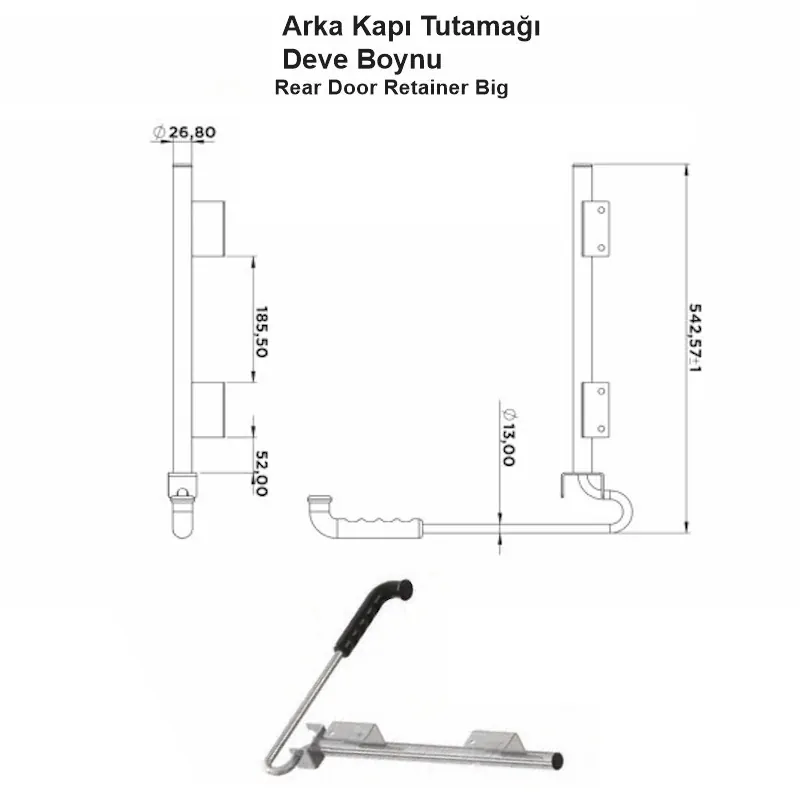 Arka Kapı Tutamağı Deve Boynu, özel eğimli yapısıyla arka kapaklara rahat erişim ve güçlü kavrama sağlar. Zorlu koşullarda uzun ömürlü performans sunar.