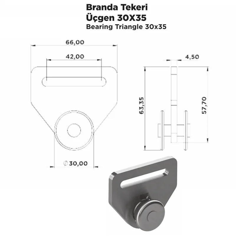 Branda Tekeri Üçgen 30×35, üçgen sac gövdesi ve dayanıklı teker yapısıyla brandaların düzgün ve sessiz hareketini sağlar.