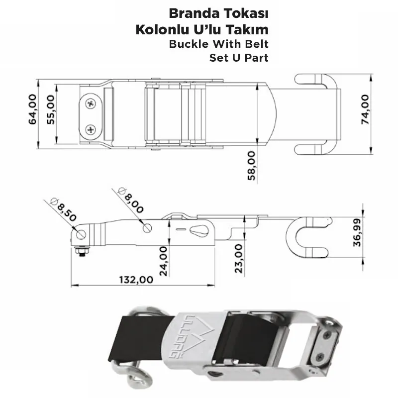 Branda Tokası Kolonlu U’lu Takım; U formunda kıvrılmış metal toka ve yüksek dayanımlı polyester kolonun birleşiminden oluşur. Bu takım, özellikle kamyon ve römorklarda brandaların düzgün gerilmesini ve uzun süreli sabit kalmasını sağlar.