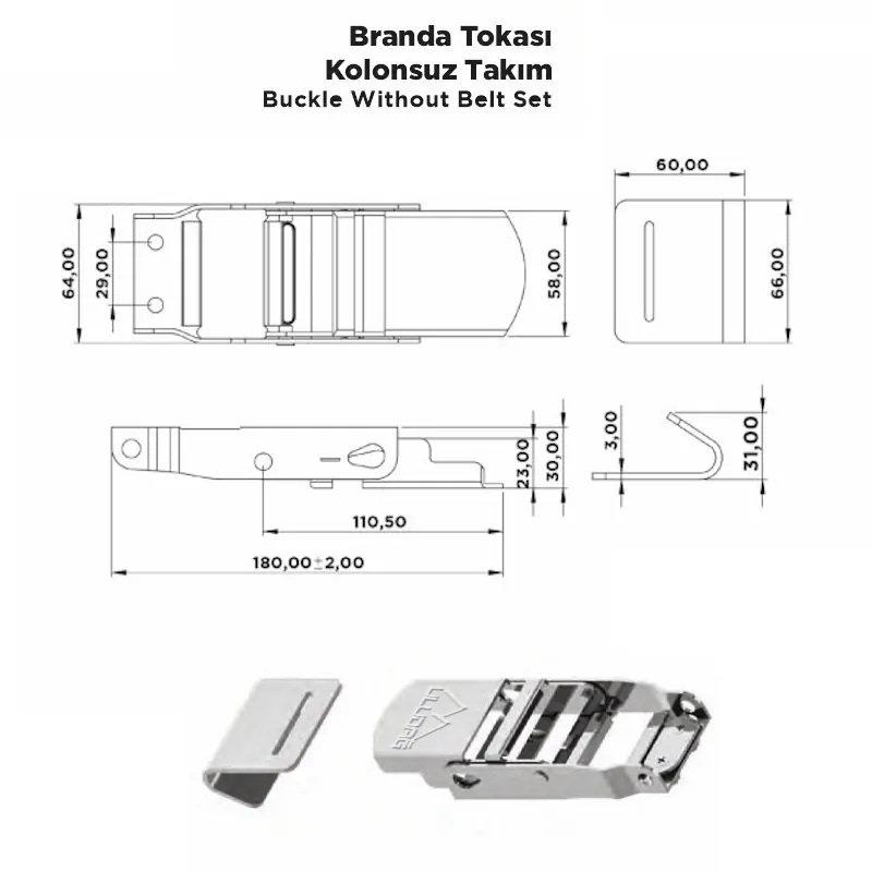 Branda Tokası Kolonsuz Takım; sadece metal toka kısmından oluşur ve kolon dahil değildir. Bu yapı, farklı uzunluk ve özelliklerdeki kolonlarla kişisel ihtiyaçlara göre uyarlanabilmesini sağlar. Genellikle kamyon, dorse ve çeşitli branda uygulamalarında, kullanıcıya montaj serbestliği sunar.