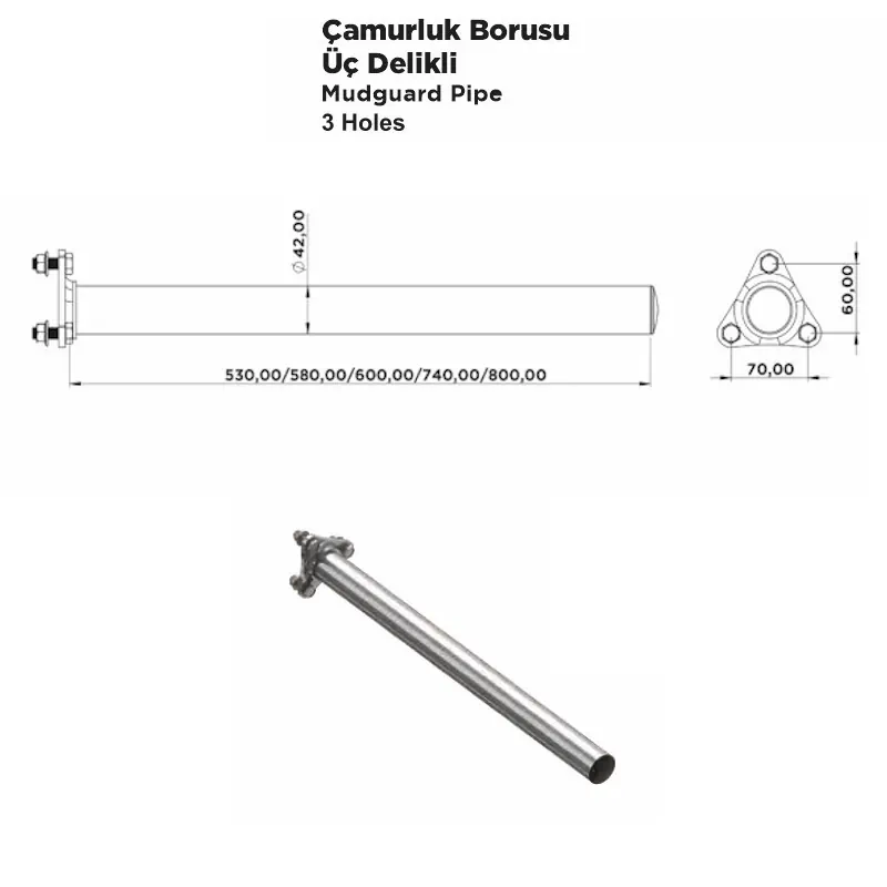 Çamurluk Borusu Üç Delikli, treyler ve ağır vasıta araçlarda çamurlukların güvenli montajını sağlayan, üç noktadan sabitlenebilen sağlam boru modelidir.