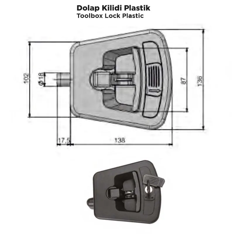 Plastik Dolap Kilidi, frigo ve kapalı kasa araçlarda kullanılan dolaplar için ekonomik ve işlevsel bir çözümdür. Kullanıcı dostu tasarımıyla kolay açılıp kapanır, taşıma sırasında kapağın sabit kalmasını sağlar.