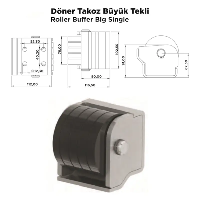 Döner Takoz Büyük Tekli, treyler, kamyon ve römork gibi araçların kasalarında oluşabilecek darbeleri sönümlemek için kullanılan, döner başlıklı, darbe emici bir takoz modelidir. Tekli yapıdaki bu ürün, özellikle yükleme esnasında forklift çatalı veya kasa kapaklarının çarpabileceği bölgelerde kasa yüzeyini korumak amacıyla kullanılır. Döner başlığı sayesinde darbeyi emerken esneklik sağlar, böylece çarpma şiddeti araç gövdesine zarar vermez.