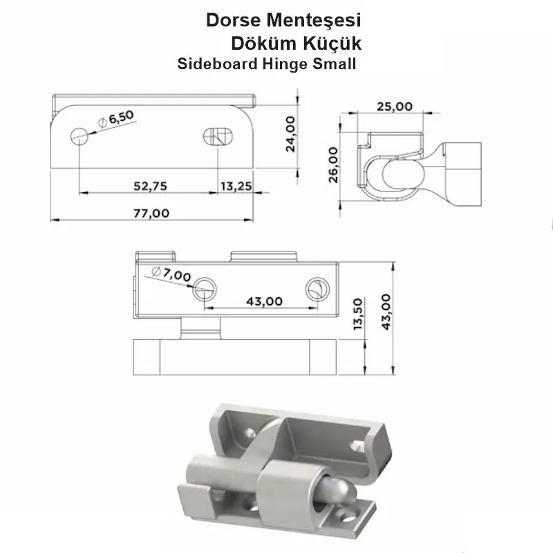 Döküm Küçük Dorse Menteşesi, özellikle kompakt kapak sistemlerinde tercih edilen dayanıklı bir bağlantı elemanıdır. Yüksek kaliteli döküm gövdesi sayesinde uzun ömürlü kullanım sağlar. Küçük yapısı sayesinde dar alanlarda da rahatlıkla montaj yapılabilir.