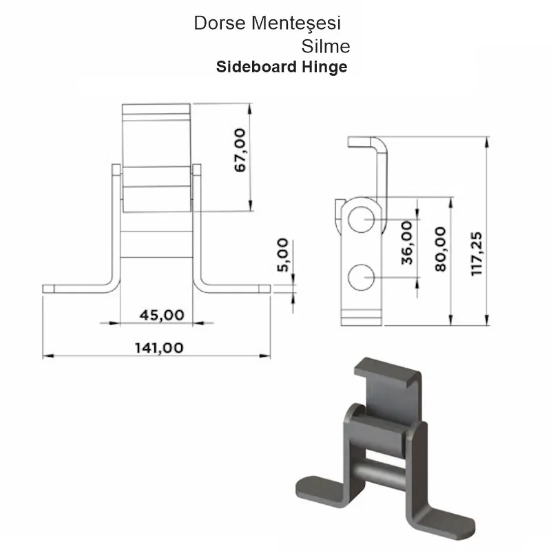 Dorse Menteşesi Silme, dorse, kamyon ve römork kapaklarında yaygın olarak kullanılan, sağlam yapıya sahip bir bağlantı elemanıdır. “Silme” tipi tasarımı sayesinde kapağa düz şekilde oturur ve estetik bir görünüm sağlar.