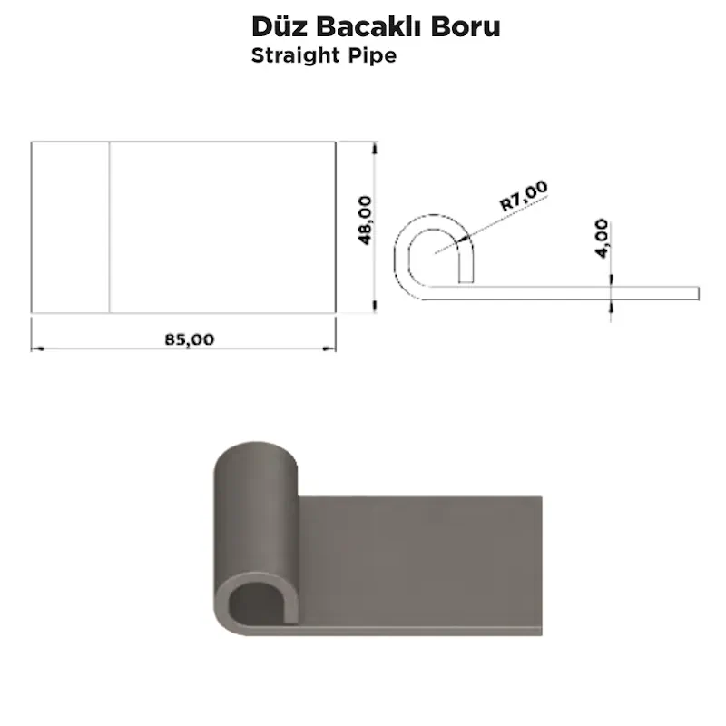 Düz Bacaklı Boru, kasa kapaklarında menteşe görevini üstlenerek kapakların kolay açılıp kapanmasını sağlar. Sağlam yapısı ve düz bacaklı tasarımıyla montaj kolaylığı sunar.