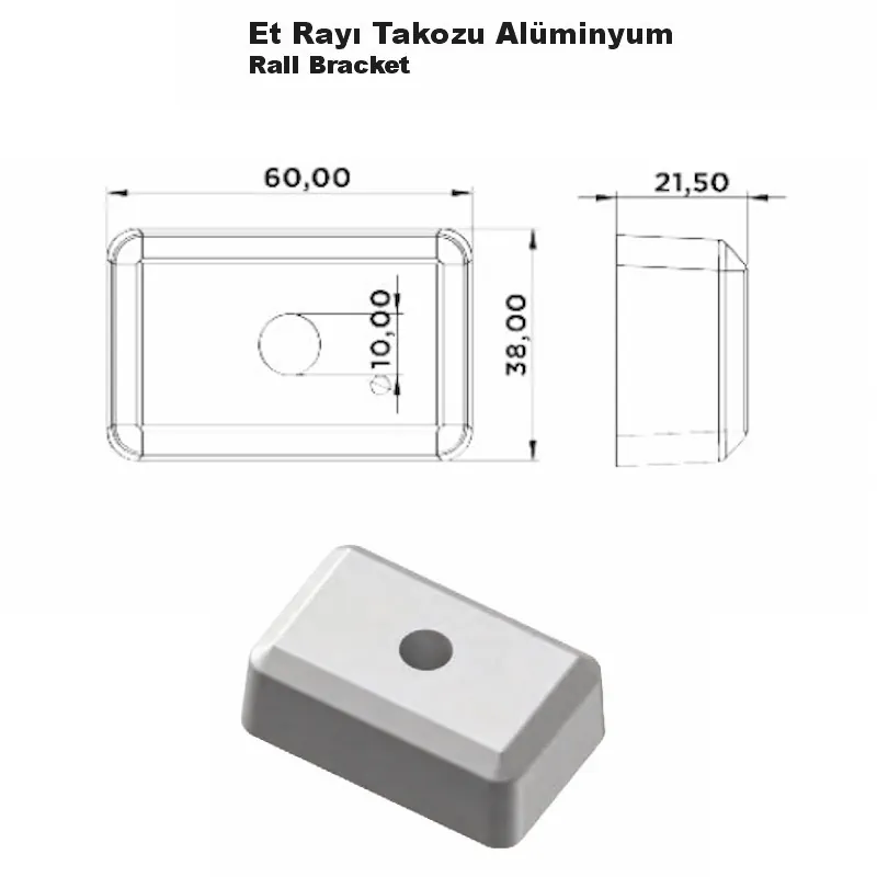 Et Rayı Takozu (Alüminyum), özellikle kapalı kasa ve frigorifik araçlarda kullanılan et taşıma raylarının uç kısımlarını sabitlemek veya taşıma sistemini sınırlandırmak amacıyla kullanılır. Alüminyum malzeme, hem hafiflik hem de yüksek dayanıklılık sağlayarak uzun süreli kullanım imkânı sunar.