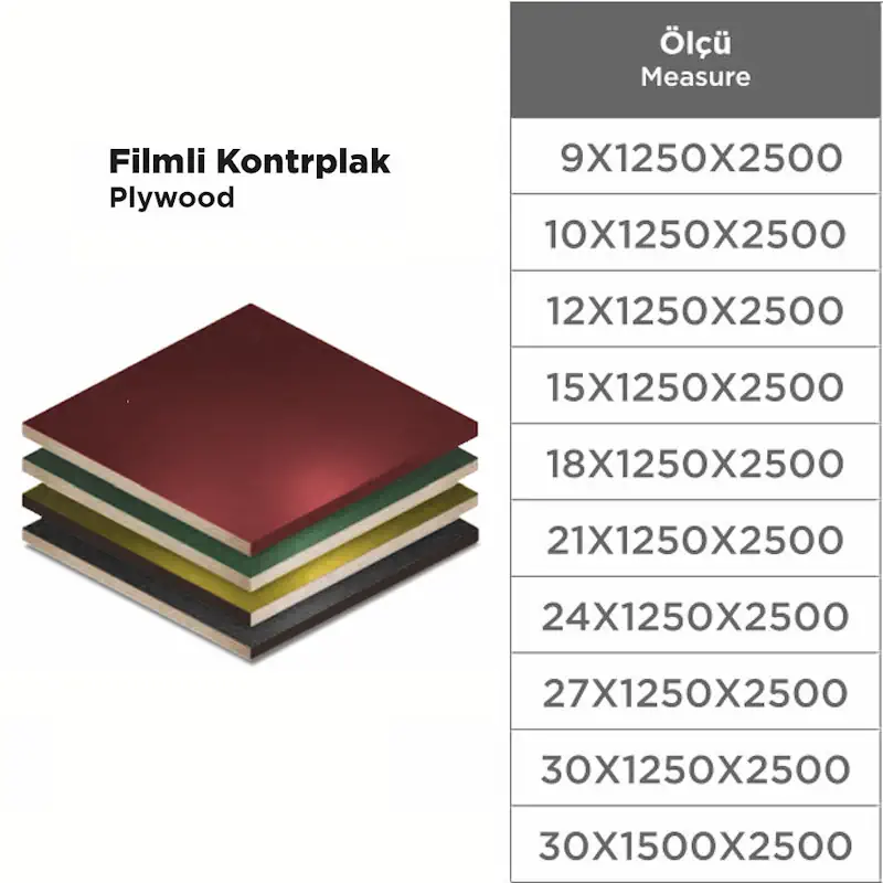 Filmli Kontrplak, özel fenolik film kaplaması sayesinde suya, neme ve aşınmaya karşı yüksek direnç gösteren dayanıklı bir yapı malzemesidir. Genellikle inşaat kalıplarında, treyler ve kamyon kasalarında, zemin kaplamalarında ve mobilya uygulamalarında kullanılır. Sert yüzeyi ve düzgün yapısı, hem estetik hem de uzun ömürlü kullanım sunar.