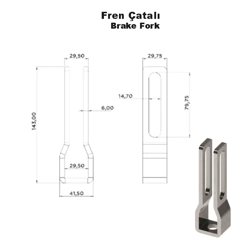 Fren Çatalı, karoserli araçlarda ve römork sistemlerinde fren mekanizmasının bağlantı elemanı olarak kullanılır. Kalın malzeme yapısı ve hassas işçiliği sayesinde fren kuvvetinin iletiminde yüksek verim sağlar. Civata bağlantı delikleri ve hareketli pim geçişi ile sistemle uyumlu şekilde monte edilebilir.
