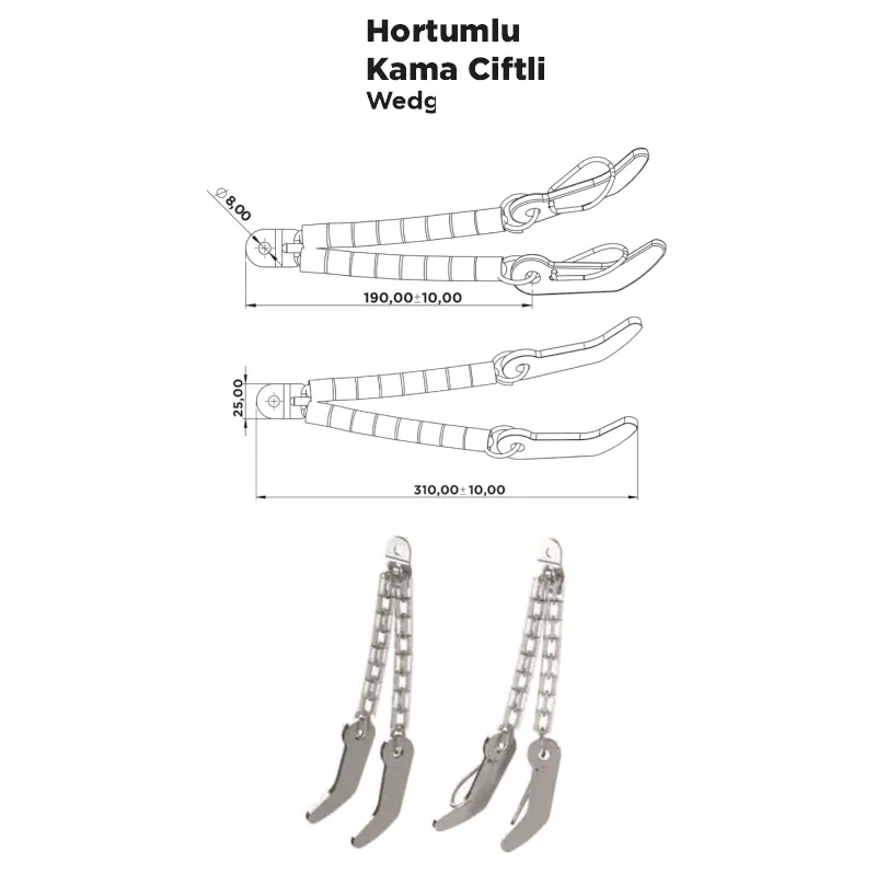 Hortumlu Kama Çiftli, kamyon ve römorklarda ahşap kasa kapaklarının hem üstten hem alttan sağlam şekilde sabitlenmesini sağlar. İki bağlantı noktasına sahip olması, yük taşımada ekstra güvenlik sunar. Hortumla kaplanmış yapısı sayesinde darbelere karşı dayanıklı olup uzun ömürlü kullanım imkânı sunar. Pratik montaj özelliği ile araç üst yapılarında yaygın olarak tercih edilir.
