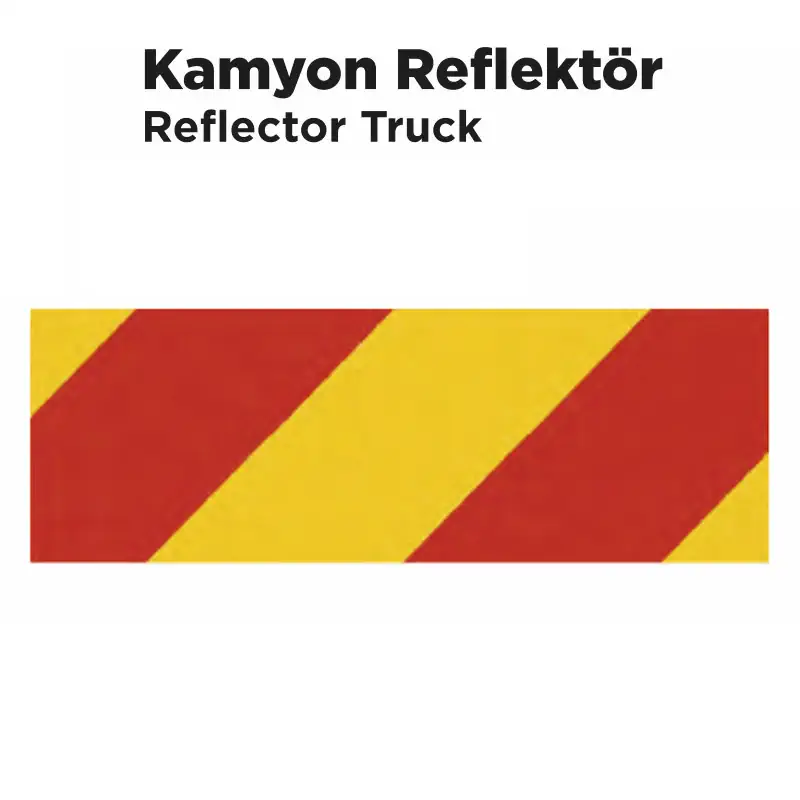 Kamyon ve treyler gibi büyük araçlar için tasarlanmış, sarı ve kırmızı renkli çapraz kalın çizgili reflektör. Gündüz ve gece maksimum görünürlük sağlar.