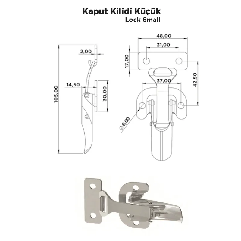 Kaput Kilidi Küçük modeli, daha hafif kapak ve bölmelerde güçlü kilitleme sağlamak için tasarlanmıştır. Kompakt boyutuyla dar alanlara kolayca uygulanabilir.