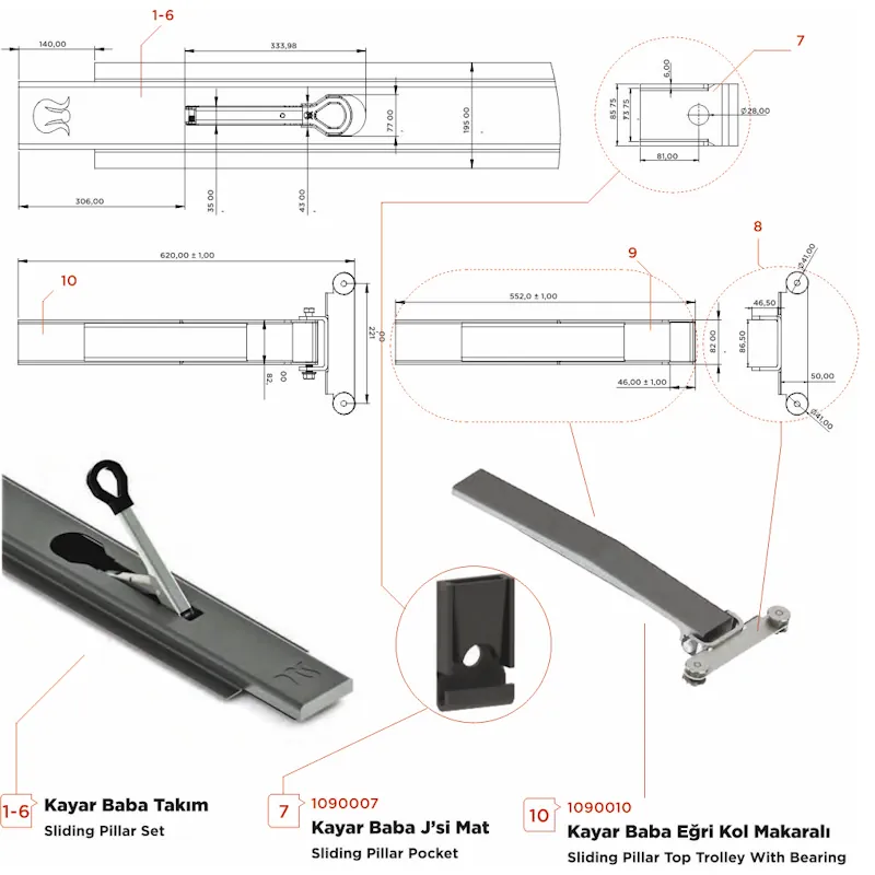 Setin içeriğinde genellikle kayar baba mekanizması, bağlantı aparatları ve ray üzerinde hareket kabiliyeti sağlayan yardımcı elemanlar bulunur. Yüksek kaliteli malzemeden üretilmiş parçalar sayesinde uzun ömürlü kullanım sunar.