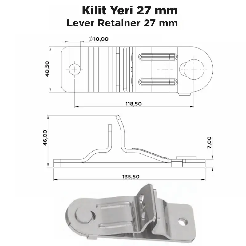 Kilit Yeri 27 mm, 27 mm kilit borusu sistemlerine uyumlu olarak tasarlanmış olup, borunun sabitlenmesini ve kilitlenmesini sağlar. Sağlam yapısıyla kasa sistemlerinde güvenli bağlantı noktası sunar.