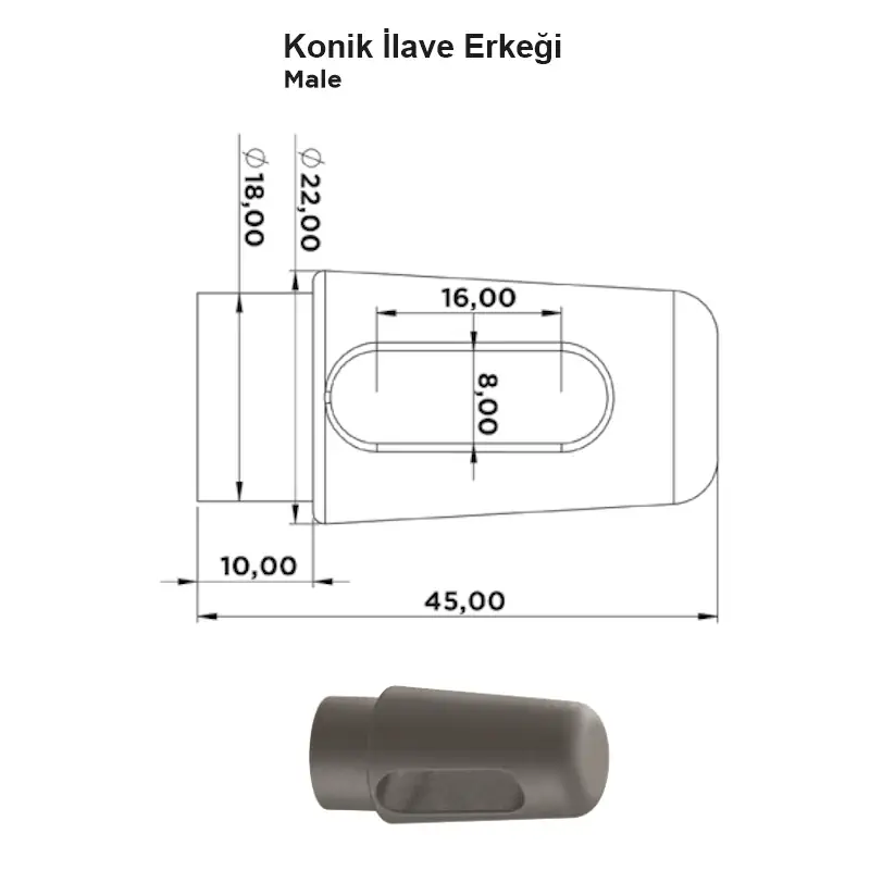 Konik İlave Erkeği, standart konik baba sistemlerine ek bağlantı veya destek noktası sağlamak amacıyla kullanılan tamamlayıcı bir parçadır. Ahşap ve damper kasa sistemlerinde güvenli sabitleme için idealdir.