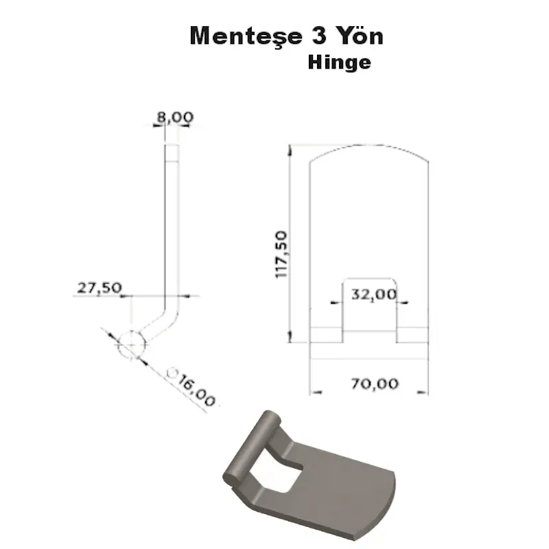 Menteşe 3 Yön, özellikle karoser, treyler, kasa ve kapak sistemlerinde çok yönlü hareket kabiliyeti gereken alanlarda kullanılır. Üç farklı açılım yönüne izin veren tasarımı sayesinde kapağın farklı yönlere açılmasını mümkün kılar ve operasyonel esneklik sağlar.