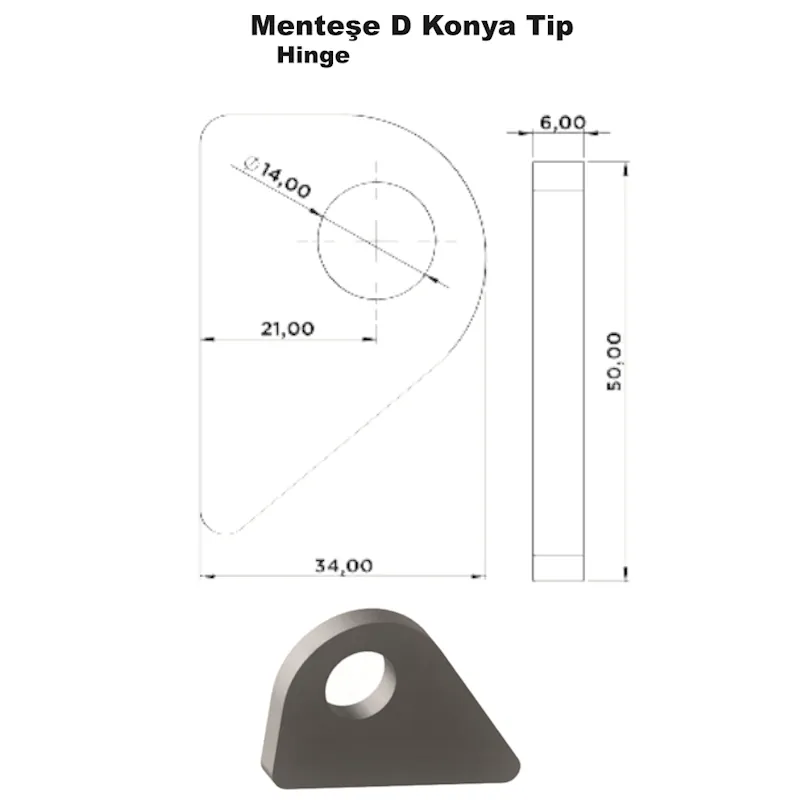 D Konya Tip menteşe, Türkiye’de yaygın olarak kullanılan, ağır hizmet tipi menteşe modellerindendir. Damperli araçlar, ahşap kasalar ve römork kapakları gibi uygulamalarda tercih edilir. Dayanıklı gövde yapısı ve paslanmaya karşı dirençli yüzeyi sayesinde uzun ömürlü kullanım sunar.