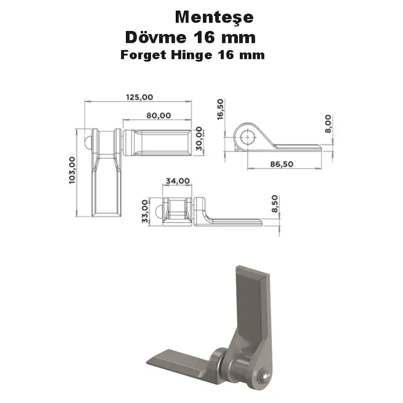 Dövme üretim teknolojisi, menteşeye olağanüstü mukavemet kazandırır. Kaynakla montaja uygun yüzeyi sayesinde kamyon, damper, römork ve iş makineleri gibi profesyonel uygulamalarda güvenli kullanım sağlar. Zorlu saha koşullarına dayanıklıdır.