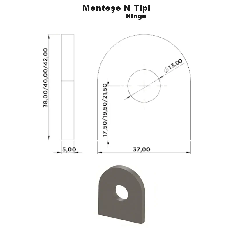 Menteşe N Tipi, özellikle kapalı kasa, damper ve treyler kapaklarında güvenli ve sağlam bağlantı sağlayan özel tasarımlı bir menteşe modelidir.