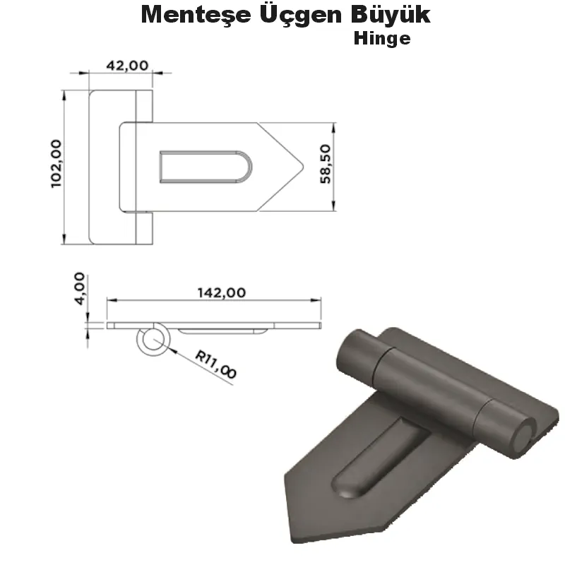 Menteşe Üçgen Büyük, geniş yüzeyli bağlantı alanı ve güçlü yapısıyla kasa ve kapak sistemlerinde dayanıklı menteşe çözümü sunar. Üçgen flanş yapısı sayesinde sabitleme kuvveti yüksektir.