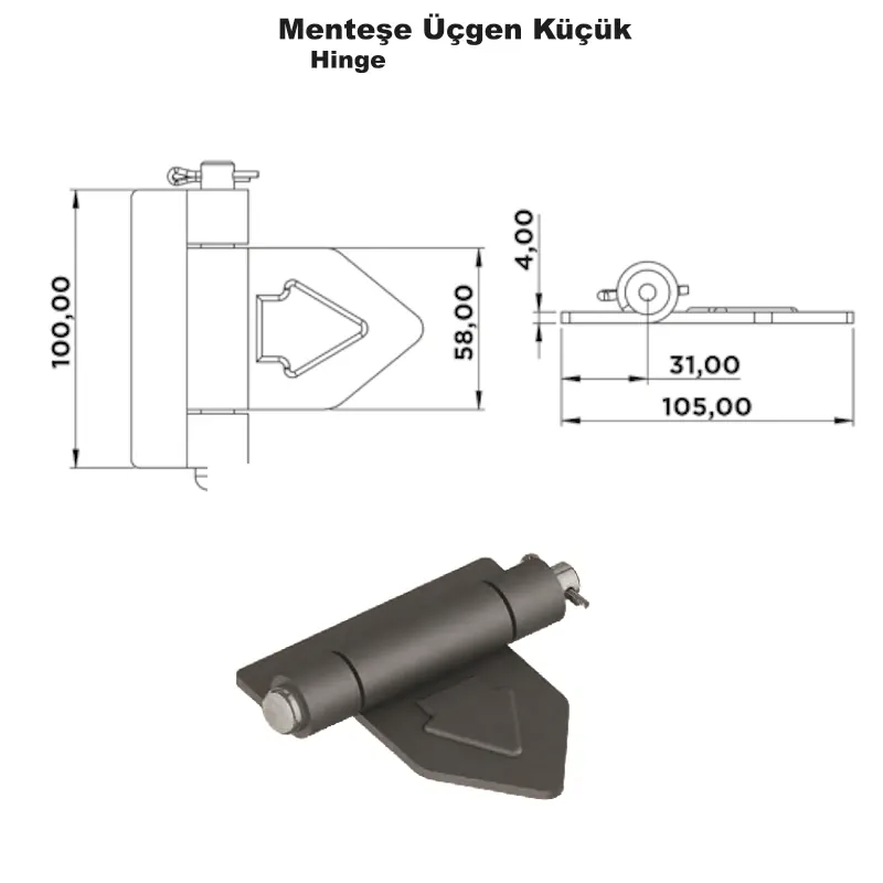 Üçgen Küçük Menteşe, küçük kapaklar, servis kapıları ve hafif kasa uygulamaları için ideal, sağlam ve pratik bir bağlantı çözümüdür. Üçgen şekilli flanş yapısı, montaj esnasında menteşenin yüzeye daha iyi oturmasını ve dengeli yük dağılımını sağlar.