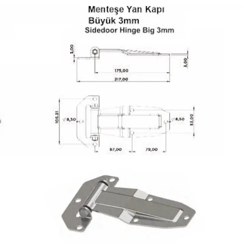 Menteşe Yan Kapı Büyük 3 mm, özellikle tır, kamyon ve kapalı kasa araçların yan kapaklarında kullanıma uygun olarak üretilmiş ağır hizmet tipi bir menteşedir. 3 mm et kalınlığı sayesinde yüksek dayanıklılık sunar ve sık açılıp kapanan kapaklarda uzun ömürlü performans sağlar.