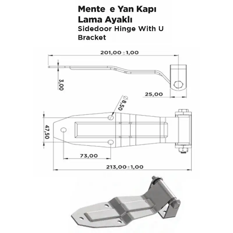 Lama ayaklı yapısı ile sağlam montaj imkânı sunan Yan Kapı Menteşesi, U braketli formu sayesinde kapalı kasa ve frigo araç kapılarında güvenilir kullanım sağlar.