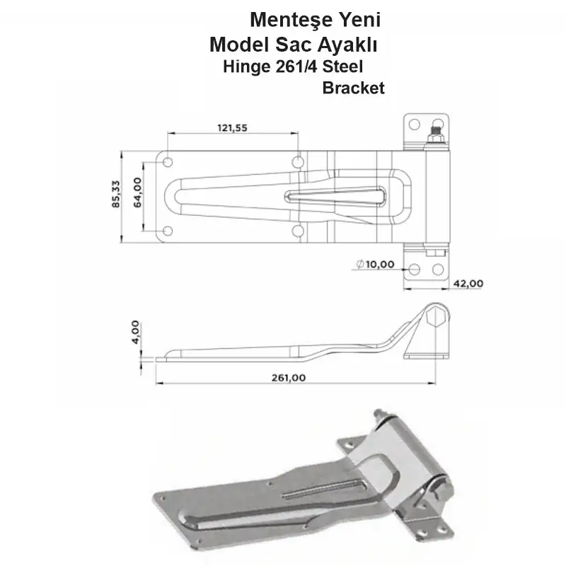 Yeni Model Sac Ayaklı Menteşe, özellikle kapalı kasa, frigo kasa ve benzeri araç kapaklarında güvenli menteşeleme ihtiyacına yanıt verir. 261/4 kodlu bu menteşe modeli, sac ayak yapısıyla güçlü bağlantı sağlar ve kapı hareketlerini sorunsuz şekilde destekler.