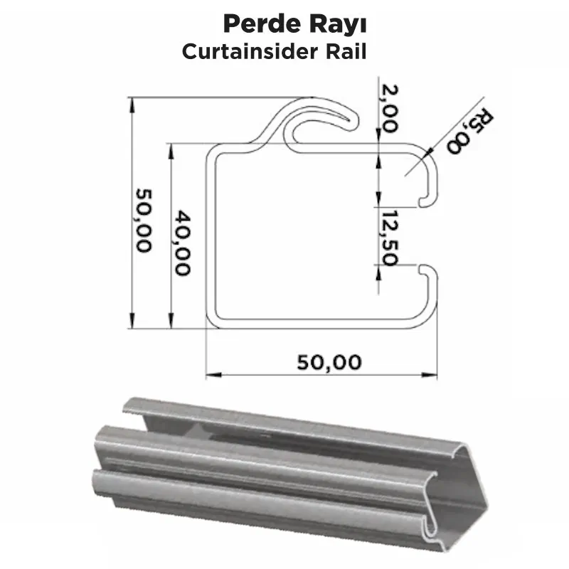 Perde Rayı, treyler ve kamyon gibi taşıma araçlarında kullanılan kayar perde sistemlerinin ana taşıyıcı parçasıdır. Perdenin açılıp kapanmasını sağlayan bu raylar, düzgün çalışma performansı ve uzun ömürlü kullanım için dayanıklı malzemeden üretilmiştir.