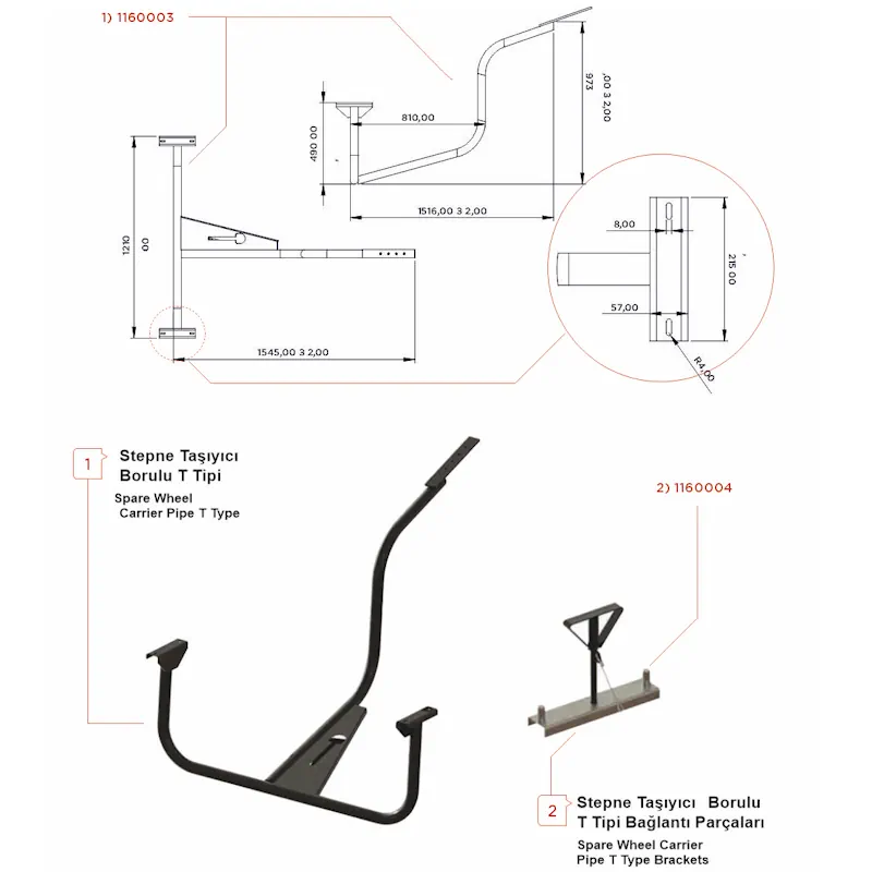 Stepne Taşıyıcı Borulu T Tipi, taşıma araçlarında yedek lastiği güvenle taşıyabilmek için tasarlanmış, boru yapılı T formunda bir taşıyıcı sistemdir. T tipi tasarımı sayesinde hem taşıma kapasitesi artırılır hem de montaj alanında avantaj sağlar.
