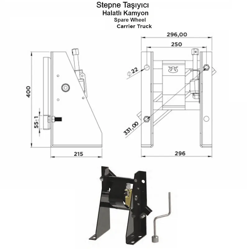 Kamyonlar için özel olarak tasarlanmış halatlı stepne taşıyıcı sistem. Güçlü mekanizması ile yedek lastiği güvenli ve pratik şekilde taşır.