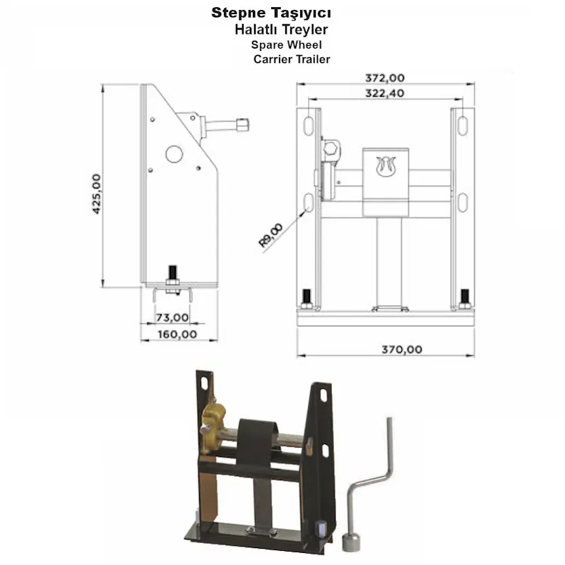 Treyler araçları için halat mekanizmalı stepne taşıyıcı sistem. Yedek lastiğin güvenli ve düzenli taşınmasını sağlar.
