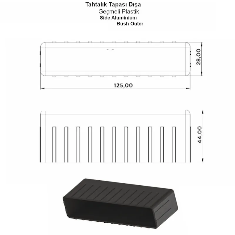 Tahtalık Tapası Dışa Geçmeli Plastik, tahtalık alüminyum profillerin uç kısımlarını kapatmak ve korumak için kullanılan dışa geçmeli, dayanıklı plastik tapa modelidir.