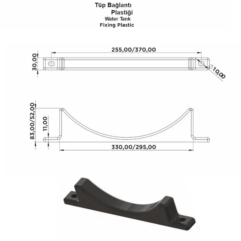 Tüp Bağlantı Plastiği, özellikle treyler ve yarı römork araçlarda kullanılan su depolarının şasiye sabitlenmesi sırasında metal kelepçeler ile depo arasında tampon görevi gören koruyucu bir parçadır. Plastik malzeme sayesinde hem titreşim emilir hem de depo yüzeyi çizilmelere ve darbelere karşı korunur.