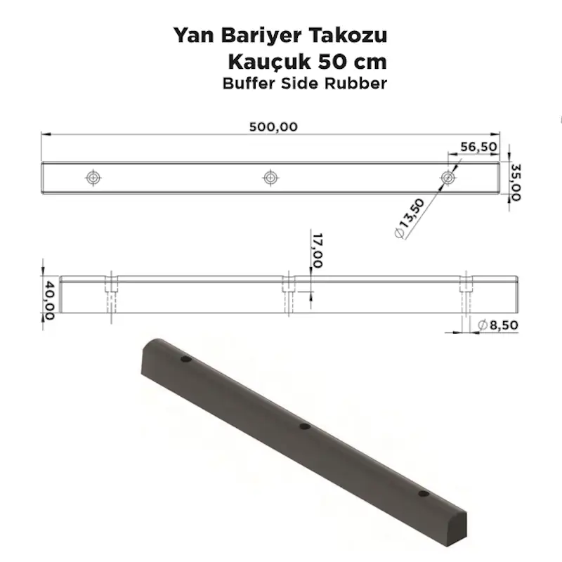 Yan Bariyer Takozu Kauçuk 50 cm, treyler, kamyon ve benzeri ticari araçların yan kısımlarında, bariyerlerin darbelerden korunması amacıyla kullanılan yüksek yoğunluklu kauçuk takozdur. 50 cm uzunluğundaki tasarımı sayesinde daha geniş bir yüzeyi korur ve darbelerin yayılmasını önler.
