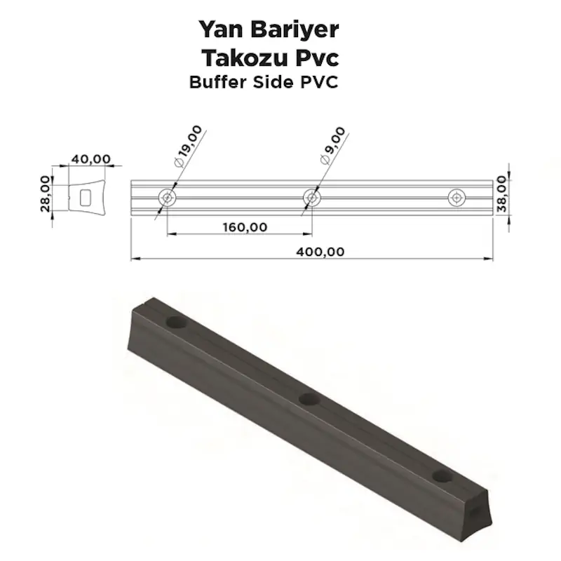 Yan Bariyer Takozu PVC, ağır ticari araçların yan koruma bariyerlerinde oluşabilecek darbeleri sönümlemek ve aracın yan panellerini korumak amacıyla kullanılır. PVC hammaddesi sayesinde hem hafif hem de uzun ömürlüdür. Forklift, kapak hareketleri ya da yükleme sırasında yaşanabilecek sert temasları minimize eder.